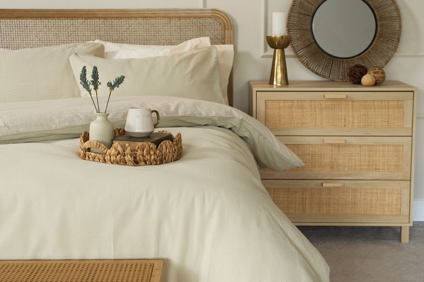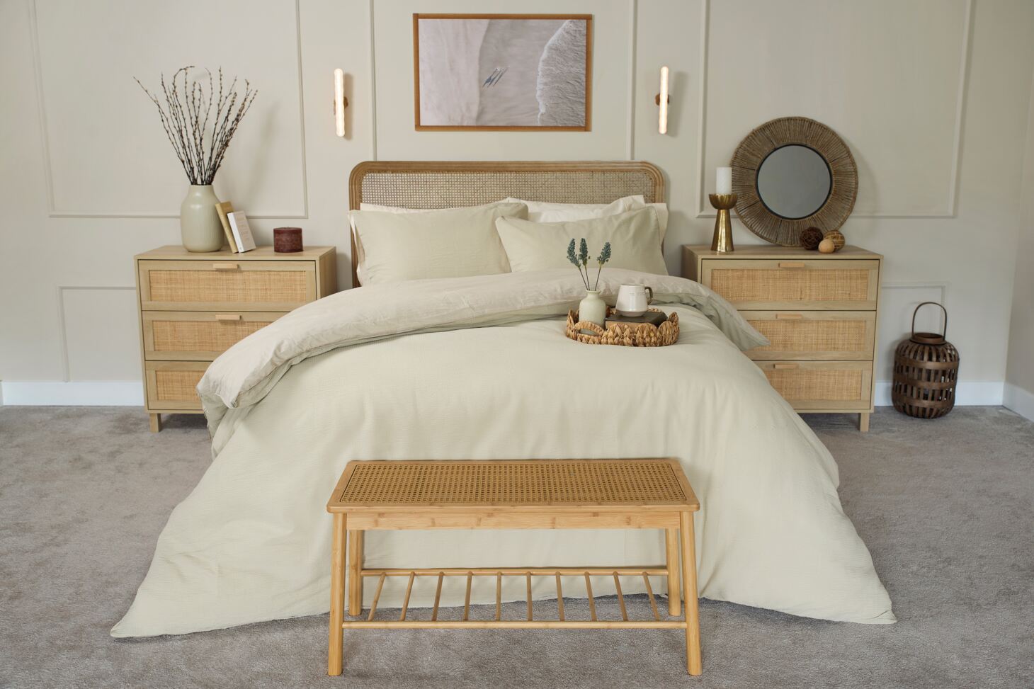 Available in two sophisticated colourways, Sage Green and Natural, Avantika is delicately trimmed for a tailored finish, blending subtle detail with timeless style. Soft, breathable, and beautifully crafted, this duvet set creates a laid-back, inviting space with a touch of textural interest, perfect for modern yet organic bedroom décor.