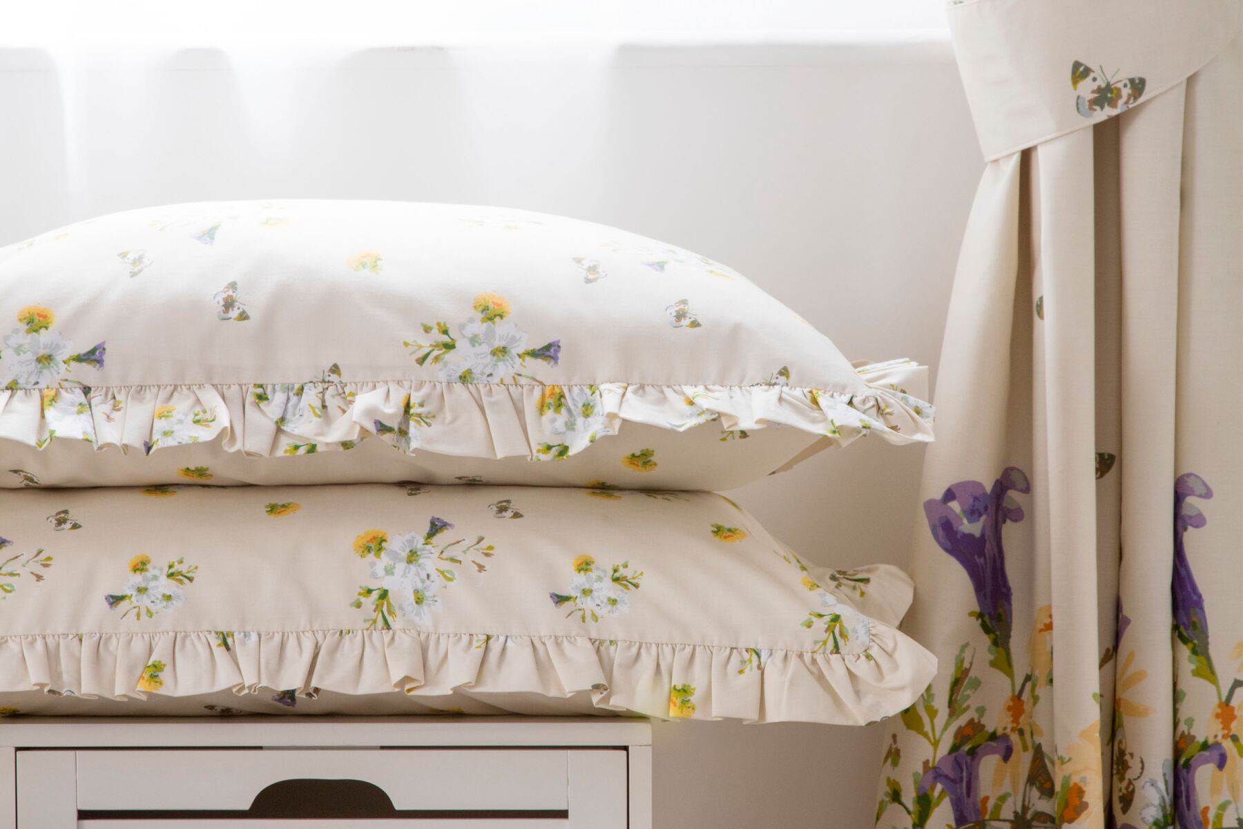 Imagine the abundance of colour when strolling through fields of wild bluebells. Bluebell Meadow is a lovely fresh design in terms of both colour and styling. On a warm ivory ground, with a delicate frill edging, the trellis effect combined with the all-over floral sprigs makes for truly pretty looking pillowcases. A welcome addition to our Country Dream Collection.