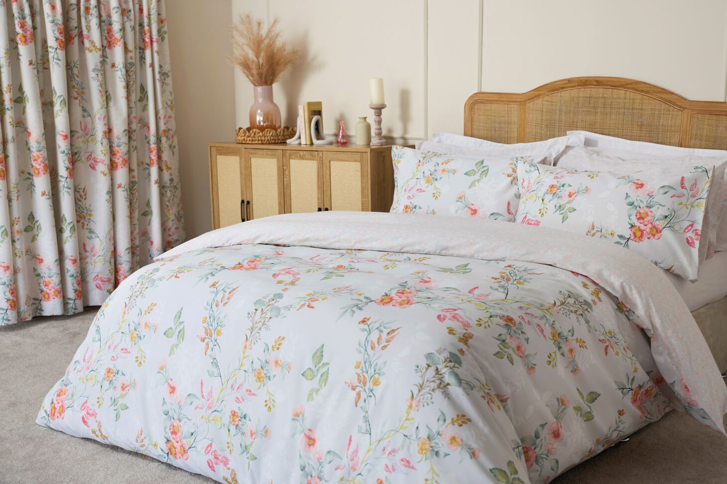 Bring the timeless charm of an English country garden into your bedroom with the Raeya Collection duvet cover set. Part of Belledorm’s beloved Country Dream Collection, Raeya combines hand-drawn floral artistry in soft blush pink, peach, butter yellow and sage green on a fresh light grey backdrop. Designed with both beauty and practicality in mind, this cotton rich set (80% cotton, 20% polyester) is soft, breathable and easy to care for, with a 150 thread count and minimum-iron finish.